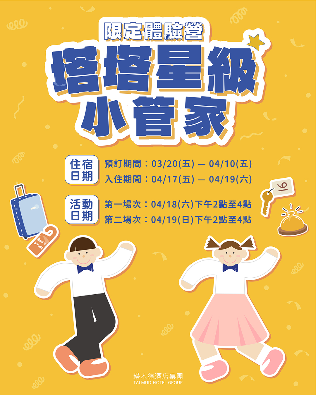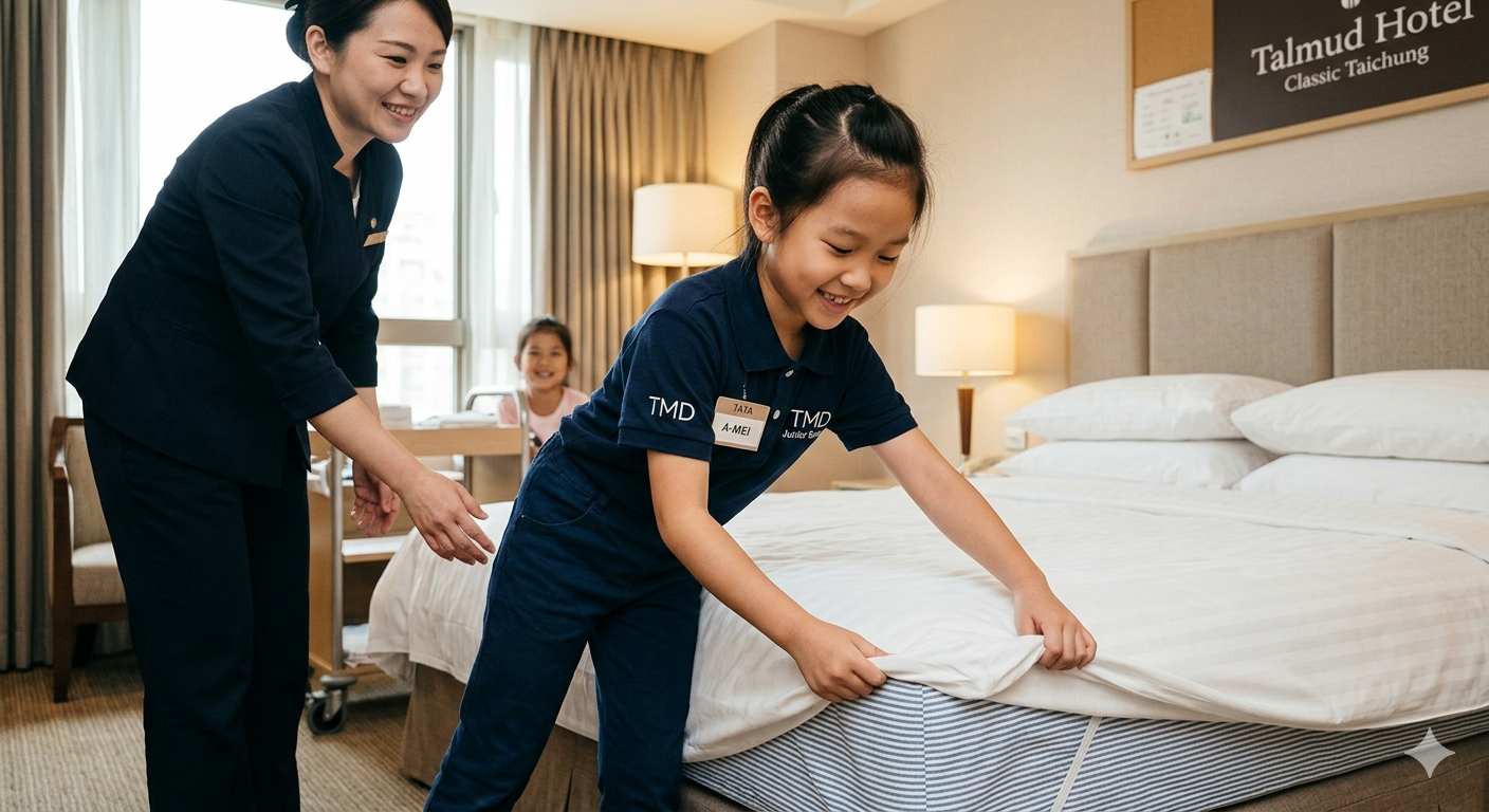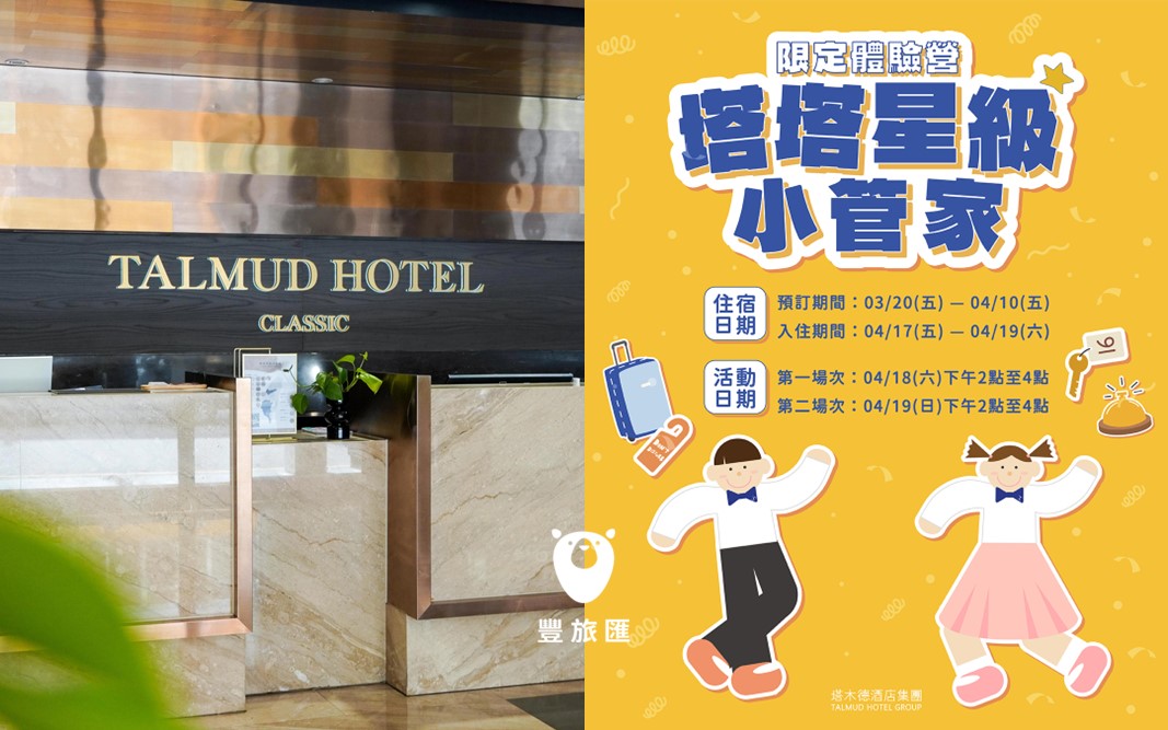 爸媽們注意!塔木德酒店集團迎來品牌史上第一屆【塔塔星級小管家|限定體驗營】,要在這個 4 月兒童節,給孩子最深刻的職人成長禮!這不只是場體驗,更是將品牌「五心服務」化為生活教育的實踐場。從櫃檯迎賓的自信問候,到飯店級鋪床的細節挑戰,兩小時沉浸式職人任務,讓孩子學會觀察與責任~限量場次每場僅 10 位名額,報名即贈專屬禮遇與結業證書。搭配住房專案更享超值回饋,快帶孩子來一場最有意義的兒童節冒險,見證那份閃耀的「星級」自信!