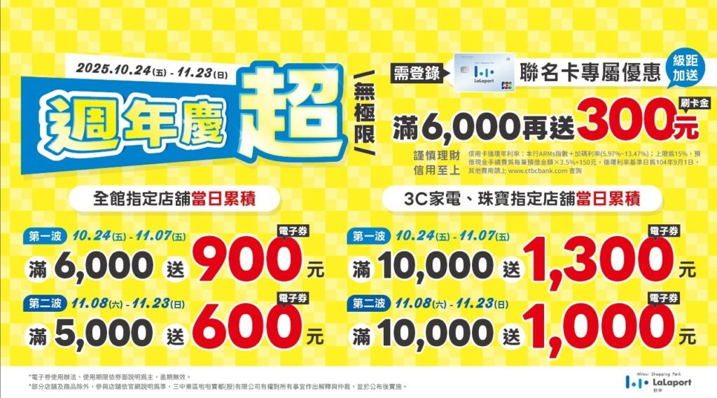 Mitsui Shopping Park LaLaport台中週年慶不僅回饋超有感,活動檔期更橫跨整整一個月,分兩波推出不同滿額贈方案,搭配中信聯名卡與購物節加碼,最高回饋率可達22%。從潮流品牌到家電精品,從購物優惠到抽獎好禮,今年秋天最強的購物盛事就在LaLaport台中。想搶優惠、抽大獎、又能累積購物節回饋,現在就是最好的入手時機!