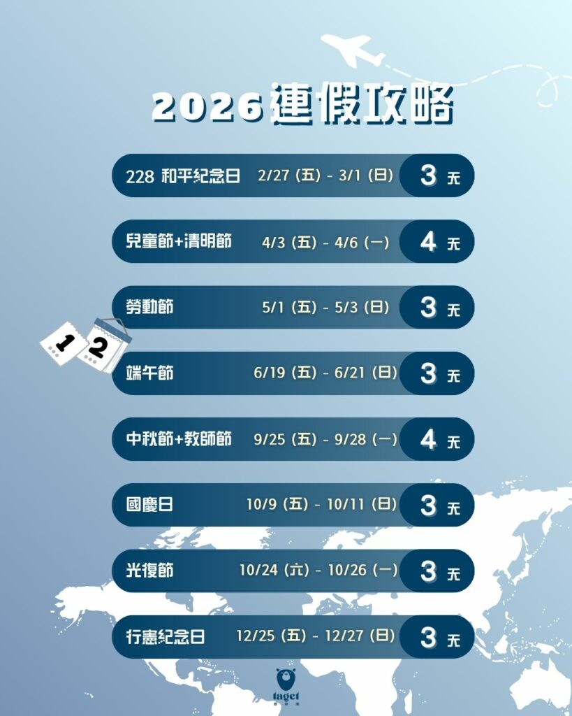 2026 年是台灣旅遊愛好者最幸福的一年!告別了補班的疲憊,我們迎來了 11 個國定假日 與 9 個自然生成的連假,你不再需要為了休假而犧牲週末,每一份假期都是純粹的驚喜👑