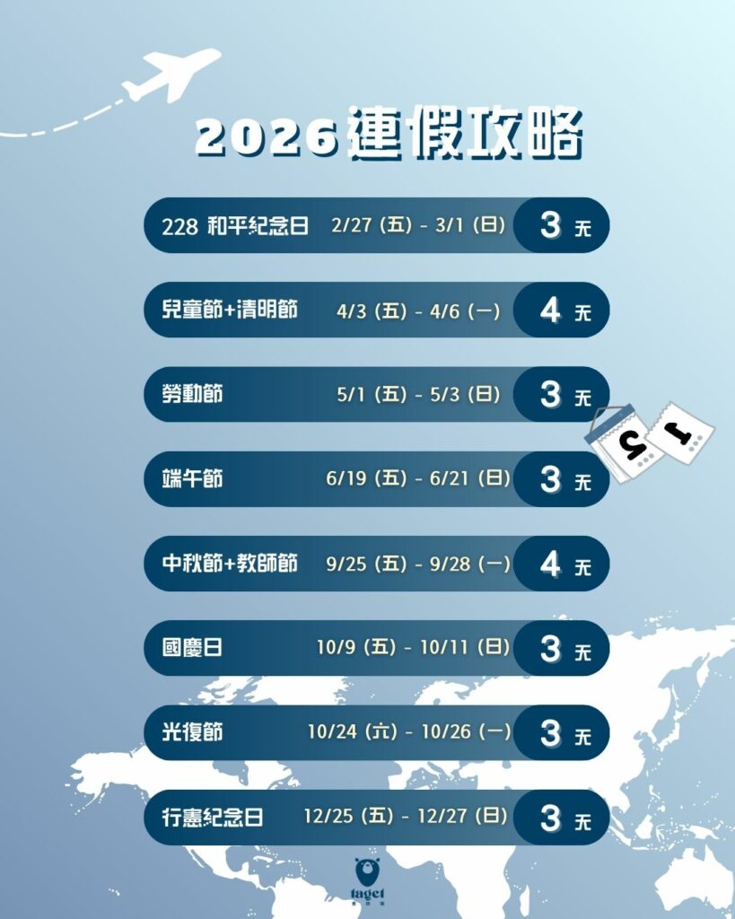 2026 年是台灣旅遊愛好者最幸福的一年!告別了補班的疲憊,我們迎來了 11 個國定假日 與 9 個自然生成的連假,你不再需要為了休假而犧牲週末,每一份假期都是純粹的驚喜👑