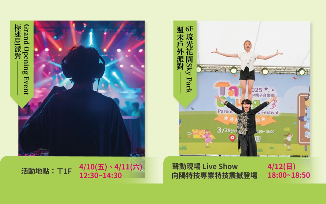 1F 極速 DJ 派對: 4/10(五)、4/11(六) 12:30~14:30 在電子重低音中感受時尚動能