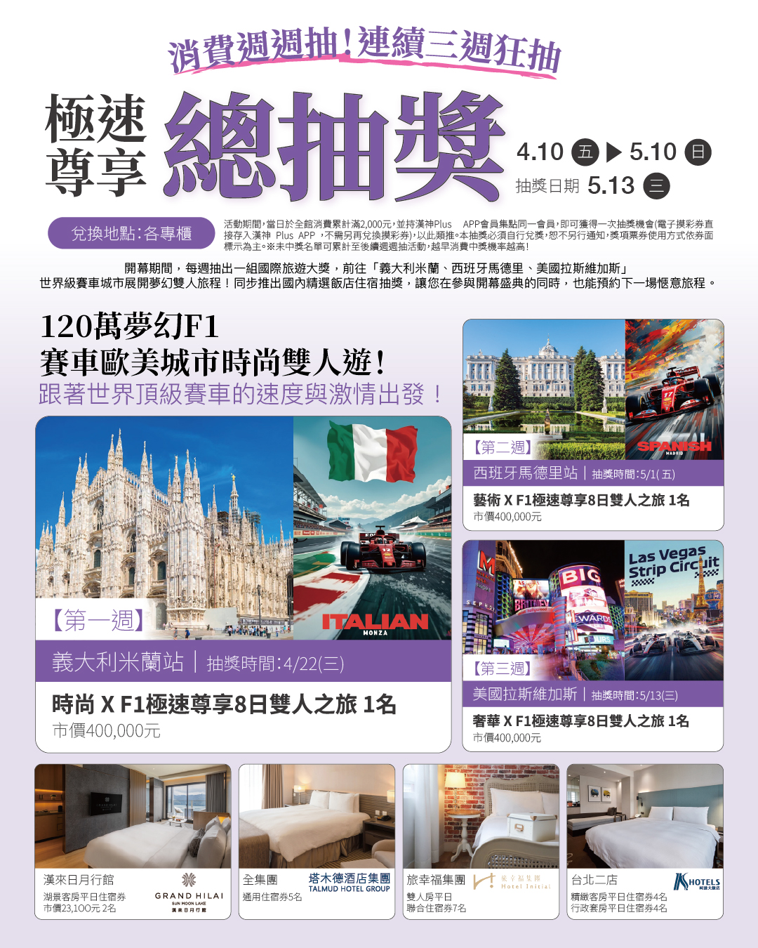 漢神洲際將開幕的喜悅,化作一場跨越國界的極速夢想~只要在 4/10 (五) – 5/10 (日) 期間,當日全館消費累計滿 2,000 元 並集點,就能參加這場震撼全台的總抽獎!