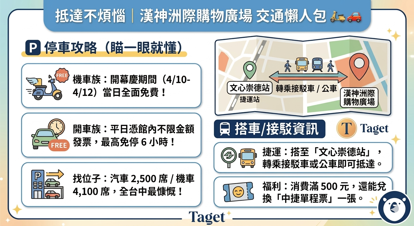 綠色交通: 搭捷運、公車或騎 YouBike 前往,可兌換 30 元漢神幣 或中捷單程票🚇